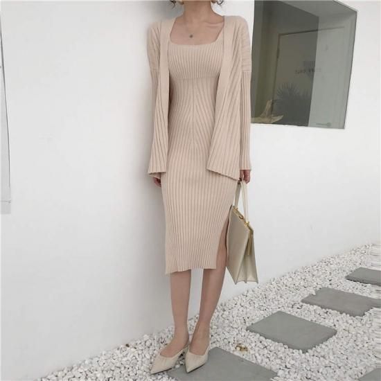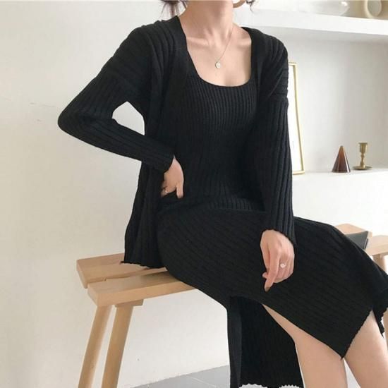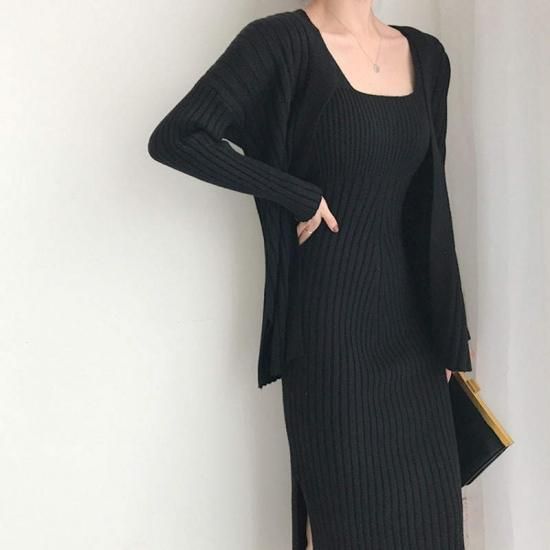 トレンド カーディガン デコルテ セットアップ ワンピース スリム スタイリッシュ 秋冬 上品 エレガント ワンサイズ