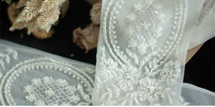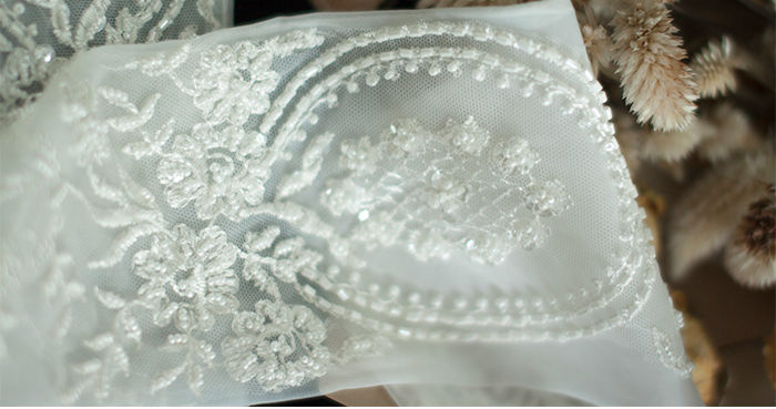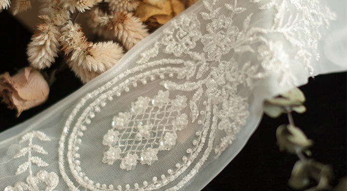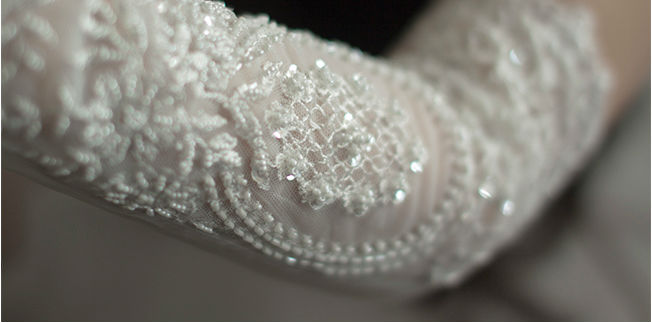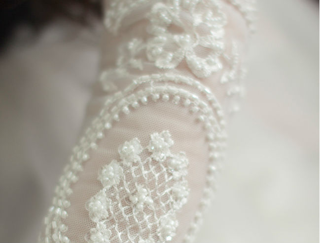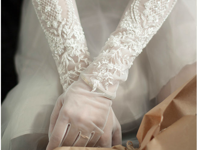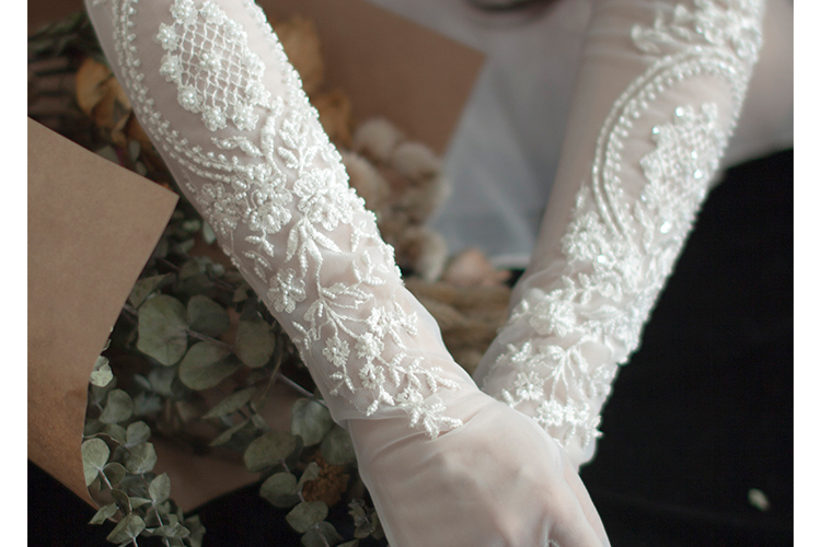 ほどよく白いレースに手首からひじまでクラシックな刺繍を入れている花嫁グローブです。